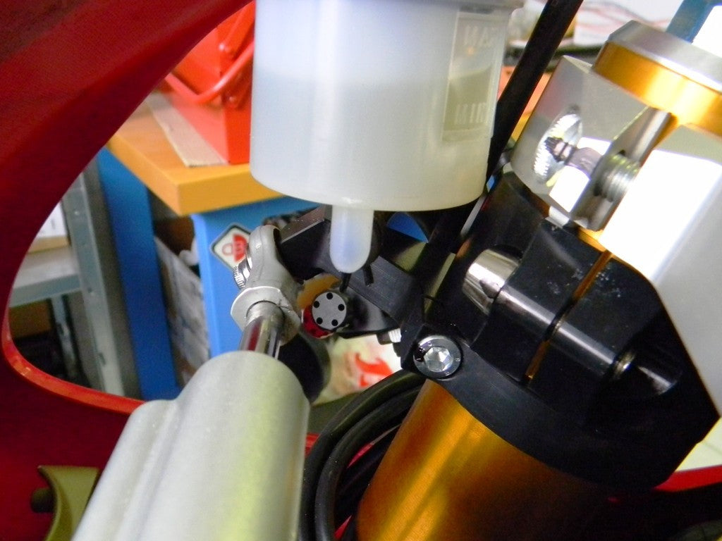 This Steering Damper Mount by Ducabike lets you retain your steering damper when you change clip-ons on the Panigale.