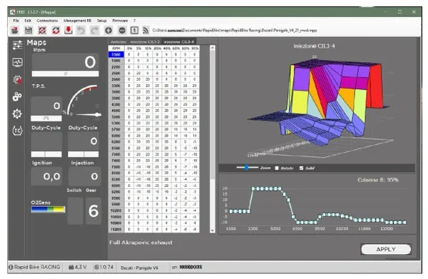 When riding the motorcycle, the self-adaptive feature determines the automatic self-correction of the air/fuel ratio maps: this active management is added up to the pre-set parameters. The adjustments set by RapidBike module improves the engine efficiency in order to reach the best performance.The self-correction process is set in multipoint technology according to RPM and TPS, for the whole range of the engine working, even when the original RPM limiter is raised (when available).