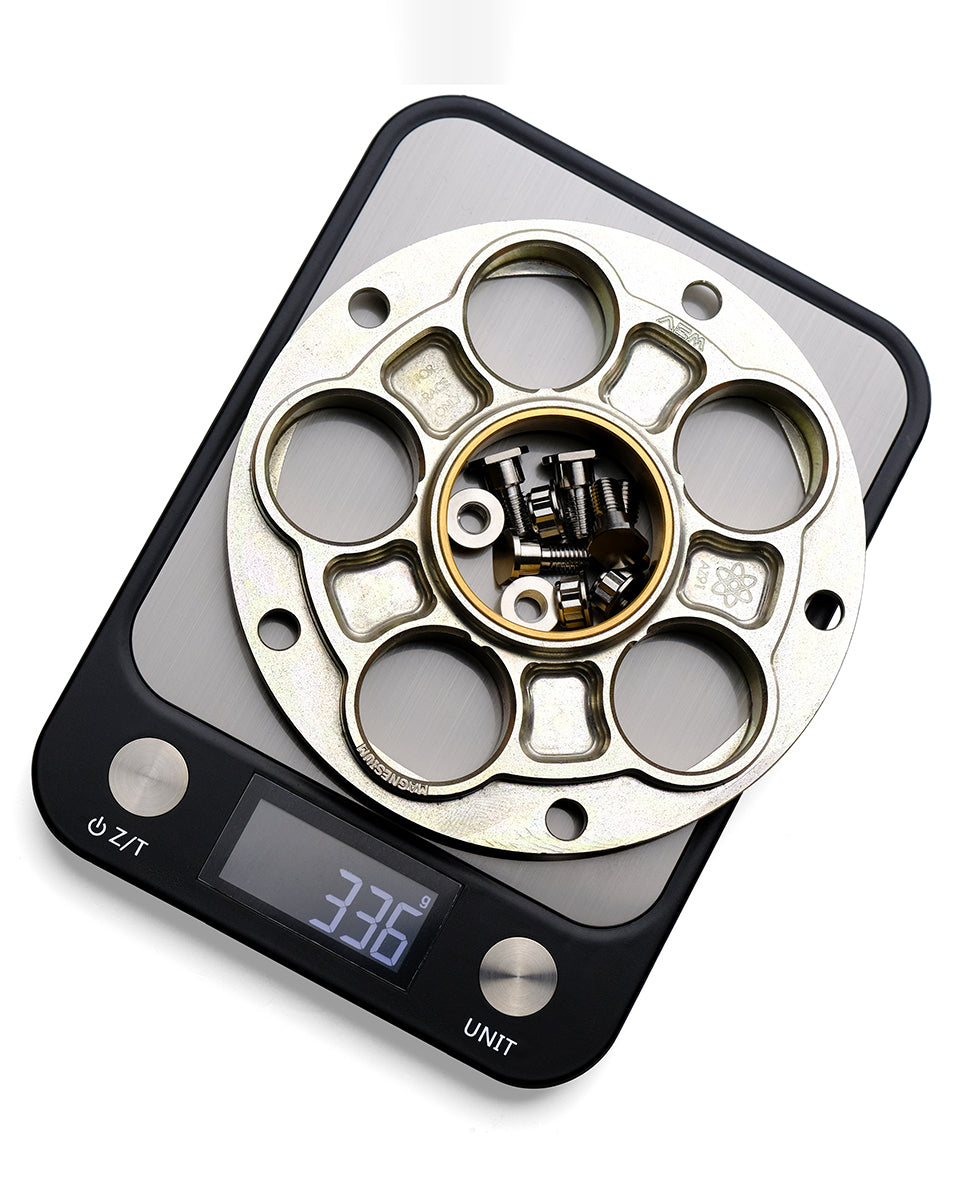This kit includes: one sprocket carrier, 5 Titanium studs, and 5 Color matched aluminum nuts.