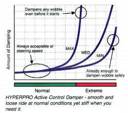 Motorcycles with a short wheelbase and an aggressive steering geometry provides the ability to make very quick changes in direction. As a side-effect it the bike is less stable, gives less feedback from uneven road surfaces, and is more difficult to control. If the front wheel is not completely inline from the direction of travel when it touches down after a small wheelie, it may cause an unwanted wobble. Steering dampers are factory installed on more and more high-end motorcycles, not only sport, but also naked and big all-roads. This is to counter these undesirable behavior. Steering dampers offer comfort and safety. ...and Hyperpro offers the best!